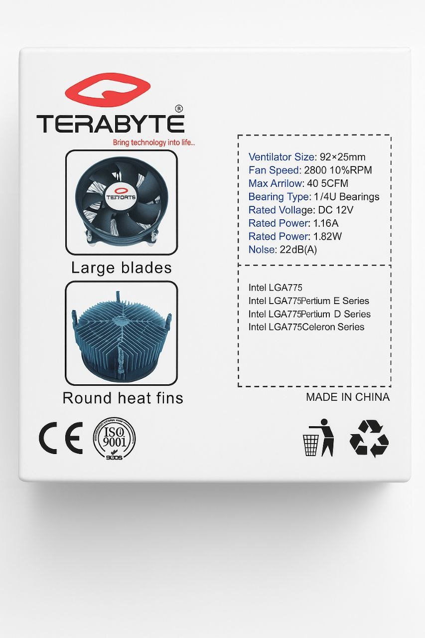 The Terabyte TB-A94 Cooler is a reliable CPU cooling solution designed for Intel LGA775 sockets. Built with large blades and round heat fins, it delivers efficient airflow while keeping noise levels low. Compact and easy to install, it is ideal for Pentium, Pentium D, and Celeron processors.